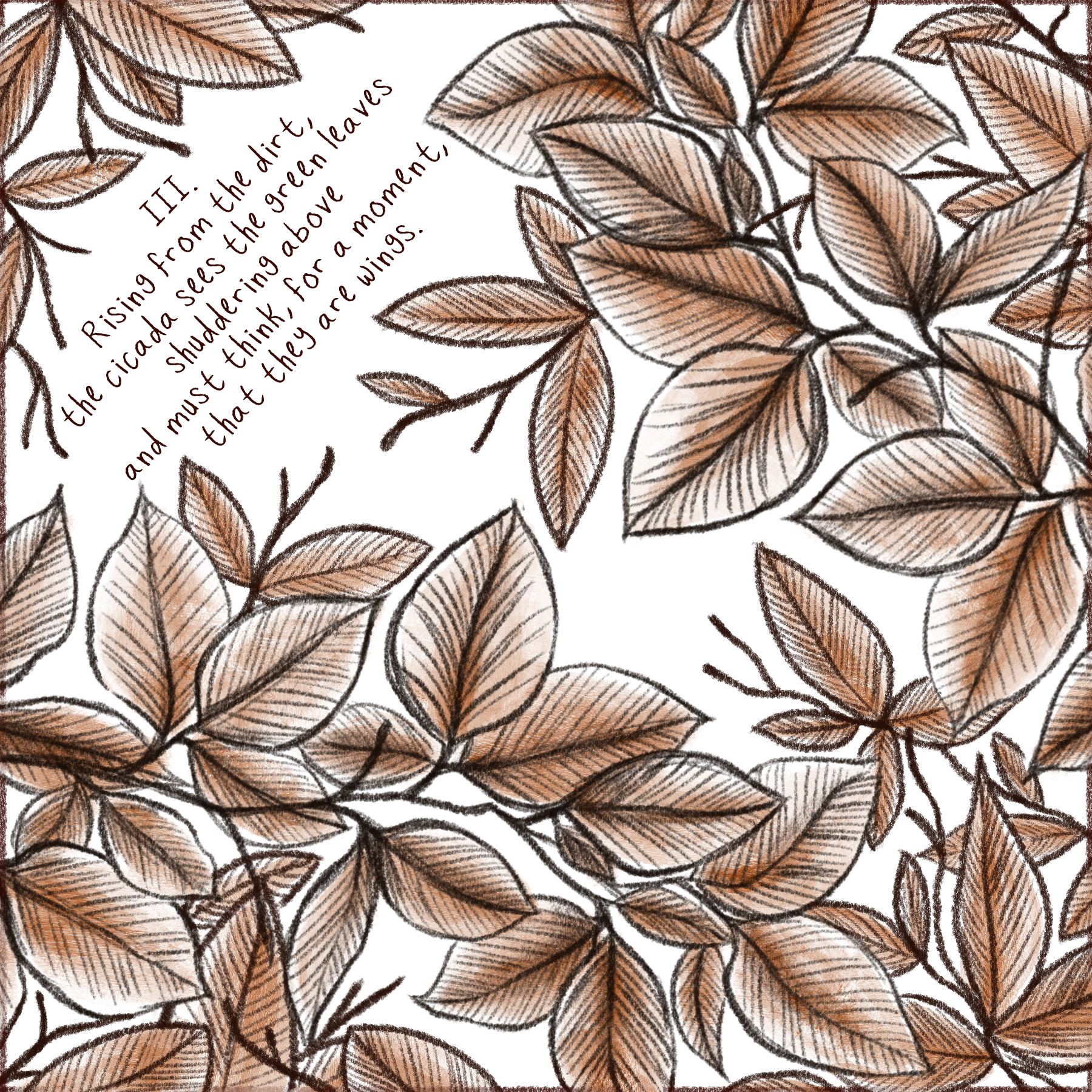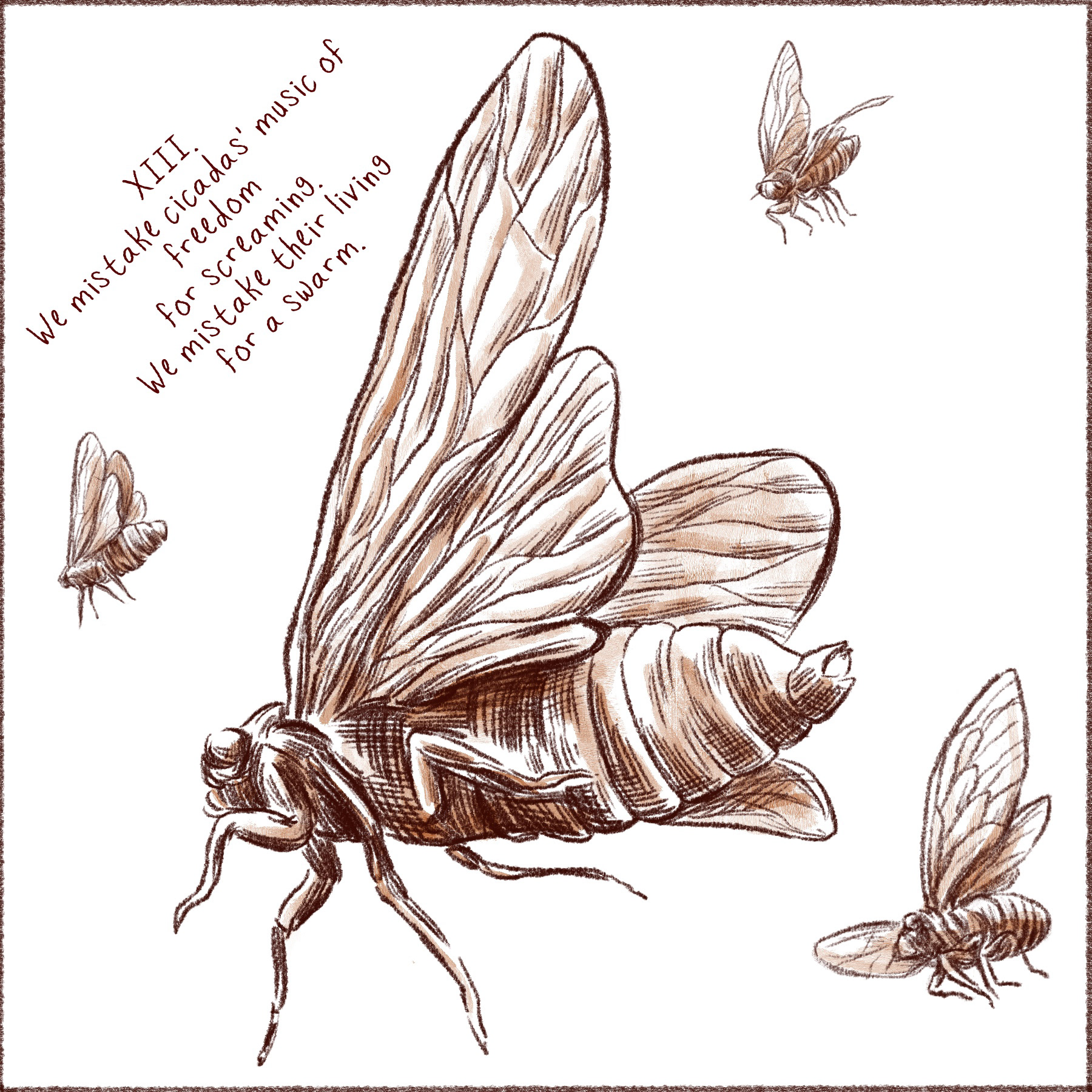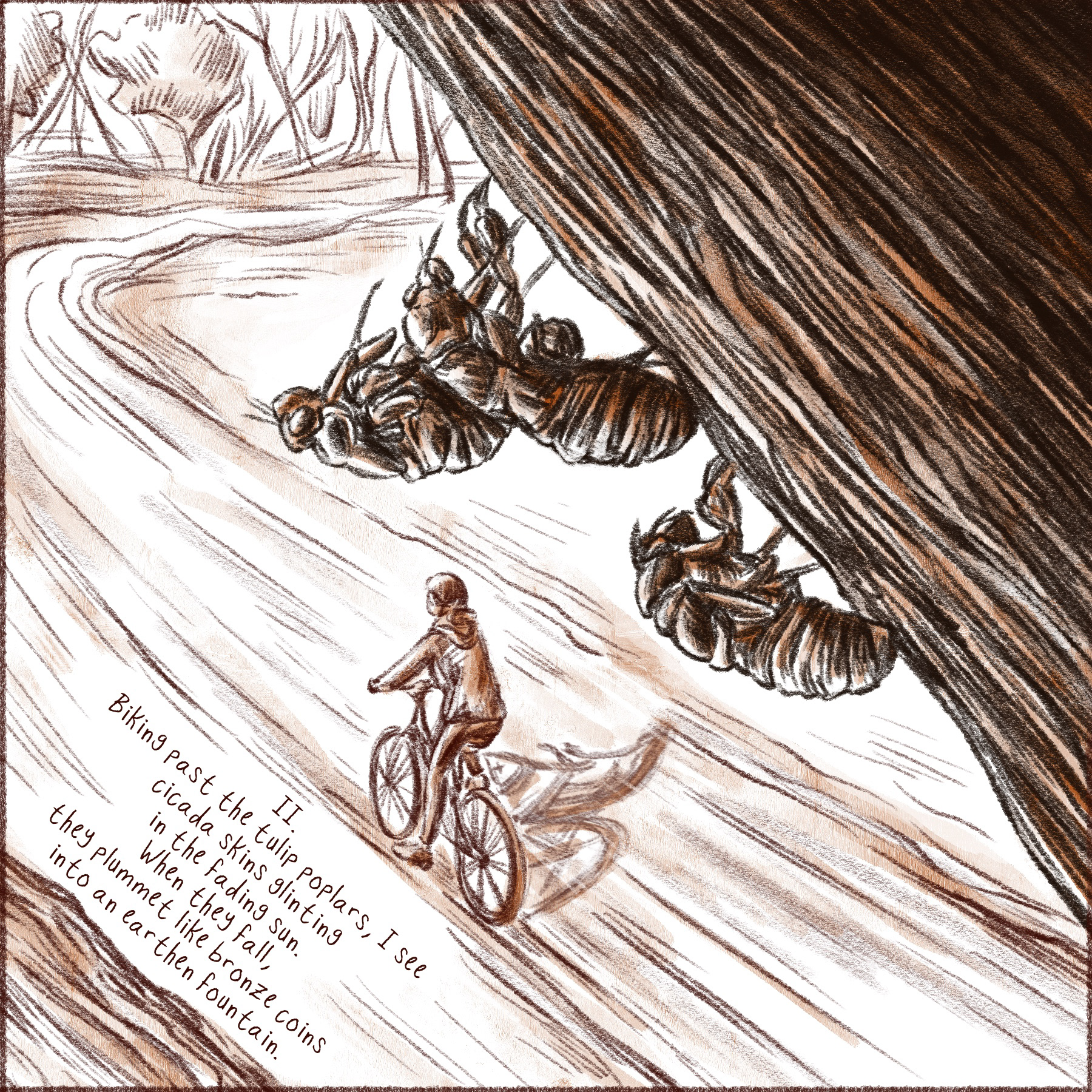 This artist book illustrates a poem written by my sister, Katy Gilmore, titled "thirteen ways of looking at a cicada." The book utilizes origami folds, where each page is attached to the next inversely, which creates a chain. the font used for the poem is created from the artist's handwriting, and the illustrations are referenced from childhood photos, nature imagery, and landmarks from our hometown in tennessee.