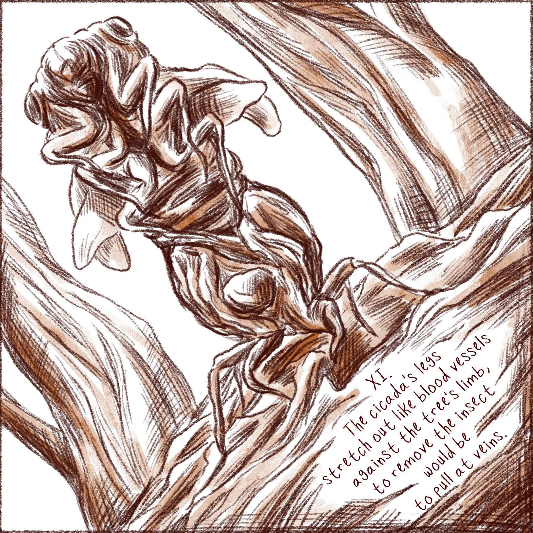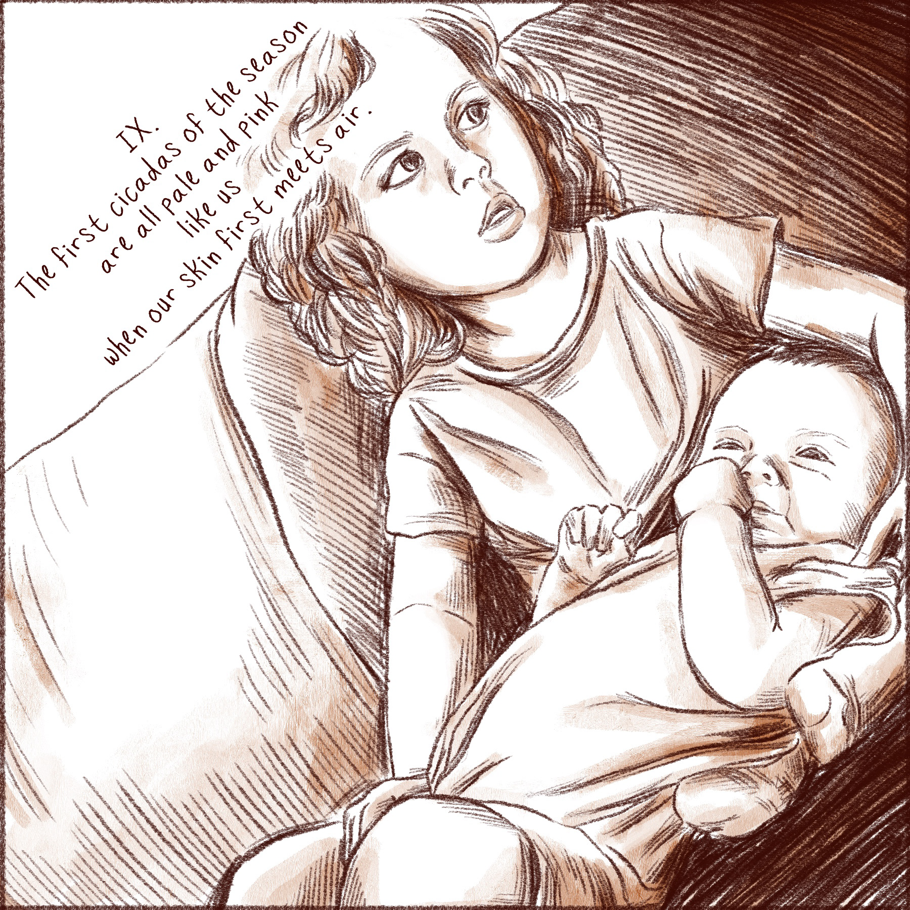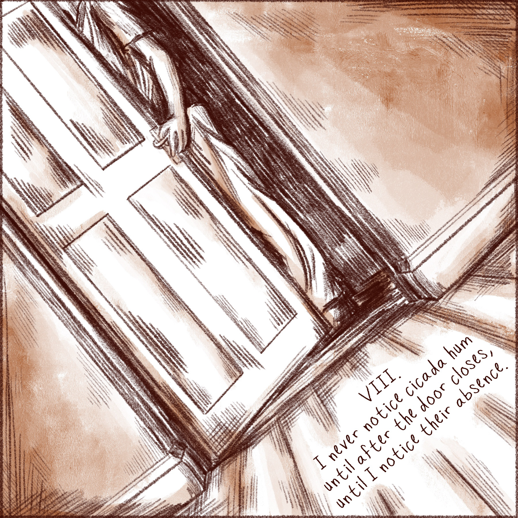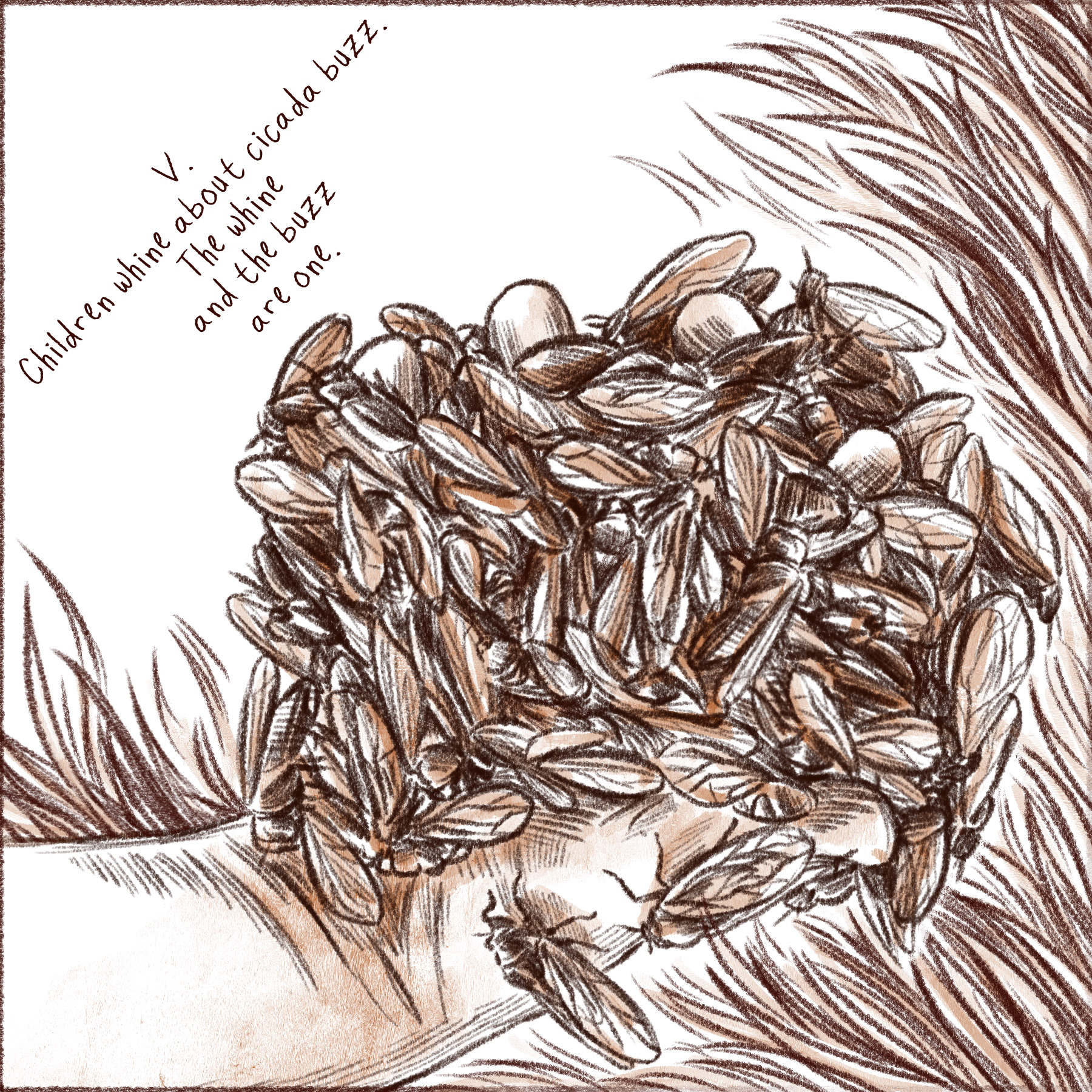 This artist book illustrates a poem written by my sister, Katy Gilmore, titled "thirteen ways of looking at a cicada." The book utilizes origami folds, where each page is attached to the next inversely, which creates a chain. the font used for the poem is created from the artist's handwriting, and the illustrations are referenced from childhood photos, nature imagery, and landmarks from our hometown in tennessee.